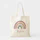 Dieser Totbeutel ist mit einem Boho-Regenbogen in gedämpften Erdtönen in Grün, Grau, Gold und dunkler Rose ausgestattet. Personalisieren Sie es mit ihrem Namen in der Handschrift der dunklen Rose.