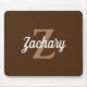 Dieses personalisierte Mauspad verfügt über einen hellbraunen Monogramm- und einen weißen Retro-Skriptnamen auf dunkelbraunem Hintergrund.