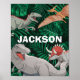 Dieses Dinosaurier-Design ist großartig für den Dinosaurier-Liebhaber in Ihrem Leben. Das Dino-thematische Dschungelblatt-Poster bietet einen Trex, Triceratops, Pterodaktyl und Raptor und kann mit dem Namen des Jungen oder Mädchens angepasst werden.