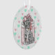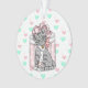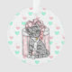 Eine hübsche, graue Katze mit einem rosa Bug und einem grünen und rosa Herzhintergrund. Personalisieren Sie dieses Ornament auf der Rückseite.