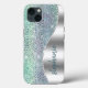 Dieses schicke Design verfügt über ein digitales Bild aus funkelnd irisierenden Diamantchips, die in einem Muster angeordnet sind, das die Schlangenhaut in schimmernden Farbtönen wie Minzgrün, Aqua, Türkis, aquamarin, lila und Lavendel imitiert. Ein silbernes Folienbild auf der rechten Seite in Form einer Welle, die mit silberfarbenem Imitat-Glitzer umrahmt ist, liefert den Hintergrund für Ihren Namen oder das Monogramm in einem stilvollen, aquamarinen, handgeschriebenen Pinsel-Schriftart.