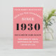 Für diejenigen, die 1930 geboren waren und ihre Geburtstagsparty feiern, haben wir die ideale Geburtstagskarte. Der rosa Hintergrund mit weißem und schwarzem Design ist einfach und dennoch elegant. Passen Sie den Text einfach an die Vorderseite und die Rückseite dieser Geburtstagskarte mit der Vorlage an. Teil des Standardprogramms für Kartenmaterial, Party und Geschenke.