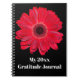 Dieses personalisierte Notizbuch hat einen großen roten Gerbera Daisy Blume Kopf auf einem schwarzen Hintergrund (anpassbar) mit fett weißem Text, der sagt, "Mein 20xx Dankeschön Journal" darauf, der geändert werden kann, um zu sagen, worauf man es will.