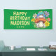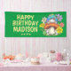 Personalisierte Girls Frogs Geburtstagsbanner. Dieses Design hat eine niedliche Frosch-Blume und Pilzdesign. Ein tolles Geburtstagsdekor für eine Geburtstagsfeier zum Thema Frosch.