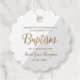 Modernes und elegantes Design mit diagonal-grauer Form, dieses kleine Mädchen Taufe Blume Form Gunst Tag ist leicht zu personalisieren. Mit einem Imitat Goldskript für das Wort "Taufe", benutzen Sie dieses Tag für Geschenke, Geschenke, für die Taufgäste Ihres Kindes. Personalisieren Sie die Begrüßung, den Namen und das Datum des Babys.