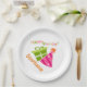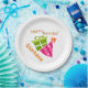 Herzlichen Glückwunsch zum Geburtstag personalisierte Teller und Geburtstagsparty-Produkte mit einem Bild eines rosa Party Hutes und einer grünen Geschenkpackung mit grün-rosa Buchstaben, die einen guten Geburtstag wünschen.