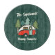 Ein individualisierbares Weihnachtsdesign mit gemütlichen und niedlichen Camper- und Kiefernbildern. Dieses Element kann mit einem Namen, einer Nachricht oder einem Feiertagsgruß personalisiert werden. Die Farben sind in Grün, Rot und Weiß gehalten, und das aquamarine und Minzgrün ist dunkel. Das ist ein tolles Weihnachtsgeschenk für eine Familie während der Ferien.