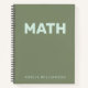 Ein schlankes und einfaches Notebook-Cover mit dem Wort "MATH" in fett blass blauen Blockbuchstaben vor einem weichen olivgrünem Hintergrund. Das saubere Layout bietet Platz für einen Namen ganz unten, was es zu einem perfekten Schulzubehör oder zu einem Geschenk für Schüler, Teenager oder Lehrer macht.