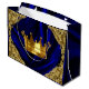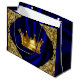 Prince Baby Dusche Geschenktasche mit schöner Goldkrone auf einem eleganten königsblauen und goldenen Hintergrund. Dieser Prinzbeutel ist leicht mit dem Text Ihrer Wahl abgestimmt und Sie können die Krone nach Bedarf verschieben und verkleinern.