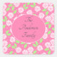 Ein rosa Blumenquadrat oder ein runder Aufkleber mit Shabby Chic. Monogram mit Ihrem Familiennamen oder Ihrem Namen.