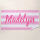 Das personalisierte Strandtuchdesign zeichnet sich durch einen eigenen Text in einem modernen, gürtnisch-rosa Drehbuch aus, das mit einem Vor- oder Nachnamen vor einem Muster weißer Streifen auf einem hellrosa Hintergrund personalisiert werden kann. Farben und Schriftart-Stil können komplett angepasst werden.