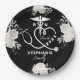 Personalisierte registrierte Krankenpfleger RN Abschluss Teller mit schwarzem Hintergrund mit Kadukus, Stethoskop und weißen silbernen Floralfarben. Geben Sie das Jahr des Abschlusses und den Namen des Absolventen ein.