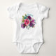 Ein Blumenspray in Aquarelltönen in Rosa, Himbeere, Lavendel, lila, Pflaume, aquamarin, orange und violett schmücken den Körperanzug dieses Mädchens. Sie können es individuell an Ihre Bedürfnisse anpassen, einschließlich der Änderung des Schriftartes und der Farbe. In meinem Geschäft kannst du einen passenden Hut finden.