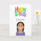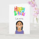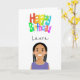 Niedliche Illustration eines weiblichen Charakters mit anpassbarem Text innen und außen und farbenfroher Geburtstagstext auf der Vorderseite. Haare, Augenbrauen und Kleidungsfarben lassen sich leicht ändern.