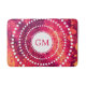 Diese Badematte kennzeichnet ein Rosa und Aprikose farbigen einen Farben-Spritzerentwurf mit einer Reihenfolge von vier transparenten Kreisen mit den Weiß punktierten Grenzen, die heraus von einem zentralen weißen Kreis ausstrahlen. In der Mitte des weißen Kreises gibt es ein kundengerechtes rosa Textfeld, damit Sie diese Badmatte mit Ihrem eigenen Monogramm oder Initialen personifizieren.