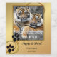 Hochzeitsweinetikett mit zwei Tigern auf goldenem Hintergrund mit niedlichen Pfotendrucken. Wunderschön für eine afrikanische oder asiatische inspirierte Feier, einen Zoo oder Safari Hochzeit oder Tierfeier.