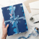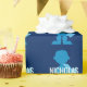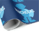 Personalisiertes blaues Superhero-Jungen-Silhouette-Kinderverpackungs-Papier. Blaues Superhero-Silhouettemuster auf dunkelblauem Hintergrund. Silhouette des kleinen Jungen hat das Kap und Stiefel, stehend in der Superhero-Pose mit den Händen auf Hüften. Personifizieren Sie mit Namen im hellen Weiß in der Mitte. Niedliches Superherothemamuster.