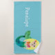 Personalisiertes blondes Imitat-Folien-Meerjungfrau-Rosa-Mädchen-Badetuch. Heller Ozeanblauhintergrund, Imitat vereiteln grüne Meerjungfrauflosse der Art auf einer niedlichen kleinen blonden Meerjungfrau. Personalisiert mit Namen im weißen Schriftart. Fertigen Sie zur Änderungshintergrundfarbe oder -Schriftart besonders an. www.SamAnnDesigns.com