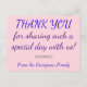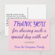 Dieses einfache, schlichte, personalisierte Hochzeitsdanken-you-Postcard-Design enthält die Nachricht "DANK YOU for share a solch special day with us!" vorne, zusammen mit einer anpassbaren Nachricht auf der Rückseite. Es zeichnet sich durch Farbtöne wie Rosa und lila aus. Es könnte genutzt werden, um jemanden zu danken, der bei einer Hochzeitsfeier Gast war.