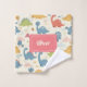 Dieses personalisierte, spielerische Waschtuch zeichnet sich durch farbenfrohe, whimsical Dinosaurier aus, die in lustigen Posen lächeln. Im Mittelpunkt des Designs steht ein handgezeichnet Namensschild.