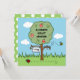 Eine süße Karte, um eine Geburt zu feiern. Die Karte zeigt eine farbenfrohe Gartenszene mit einem Apfelbaum, einer Hummel, die herumschnüffelt, und einem Ladybird, der auf dem Boden schwebt.
