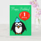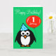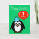 Personalisierte Geburtskarte | Pinguin mit Party Hut und rotem Ballon. Niedliches Design des Cartoon mit individueller Altersnummer. 1. Baby zum Beispiel. Ein Jahr alter Junge oder Mädchen.