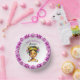 Hübsche kleine Prinzessin mit einer Tiara und rosa Blume im Haar. Geben Sie den Namen in den personalisierenden Bereich ein. Teller der Geburtstagsparty.
