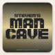 Fügen Sie mit diesen benutzerdefinierten Untersetzer eine Touch Klasse zu Ihrer Männhöhle hinzu. Das Hintergrundbild zeigt ein cooles Rautenblechmuster (Lauffläche), das oben und unten dunkler ist und in der Mitte goldgelb wird. Es heißt "Man Cave" in einem coolen Schriftart im industriellen Stil mit Schraubenkopf-Spuren in schwarz. Passen Sie es an für personalisierte Höhlen Untersetzer.