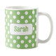 Eine personalisierte Polka dot Tasse, die mit Ihrem Namen gedruckt wurde! Es ist mit einem Muster weißer Polka-Punkte über einer grünen Hintergrundfarbe entworfen, die die Tasse umschließt. Ihr Name, wenn personalisiert, wird auf beiden Seiten der Tasse über das grüne Polka Punktmuster gedruckt. Es ist ein großartiges Geschenk für alle, die Polka Dotmuster und grünen Trinkbehälter Lieben.