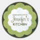 Personalisieren Sie Ihre hausgemachten Konserven, gebackenen Leckereien und andere Goodies mit diesen runden Konservenaufklebern, die sich leicht mit Ihrem Namen personalisieren lassen. Das Design ist eine grüne Blumenform, die mit kleinen Polka-Punkten dekoriert ist. Ideal für hausgemachte Pickles!