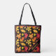 Auffallende Herbstblätter fallen anmutig vor schwarzem Hintergrund auf den Boden. Der Rand hat einen orangefarbenen Streifen, der den ganzen Weg hindurch verläuft. In der unteren rechten Ecke ist ein diagonales Banner in schwarz mit einem orangefarbenen Rand, wo Sie mit Ihrem Namen in einem modernen gelben Skript personalisieren. So eine schöne, lustige Tasche für den Herbst! Ideal für schnelle Ausflüge zum Bauer Markt, für Übernachtungen und vieles mehr.