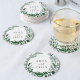 Mit diesen schicken botanischen Untersetzer können Sie Ihre Hochzeitscocktailstunde oder Ihren Empfang personalisiert bezaubern. Das Design kennzeichnet Ihre Namen, umgeben von einem Kranz von Aquarellblättern und Blätter in reichen Farbtönen von Jägern grün. Entworfen, um unsere Hochzeitskollektion im Wilden Wald zu ergänzen.