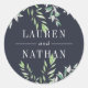 Mit diesen eleganten botanischen Hochzeitsaufklebern, die Ihre Namen gerahmt durch einen oberen und unteren Rand von üppiger Aquarell und Blattwerk auf einem reichhaltigen marineblauen Hintergrund darstellen, können Sie Ihre Einladung oder Favoriten Siegel. Koordiniert mit unserer Hochzeitskollektion im Winter Sage.