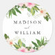 Elegante, blumengeschmückte Hochzeitsaufkleber mit Ihren Namen, umgeben von blühenden Blume in Rosa, Blau und Pfirsichfarben mit grünen Blätter. Die rosafarbenen Blumenaufkleber eignen sich hervorragend als Umschlag Aufkleber, Gastgeschenk, etc. Entworfen, um mit unserer Hochzeitskollektion Soft Pink Floral zu koordinieren.