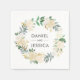 Stylen Sie Ihre Hochzeit mit diesem herrlich eleganten, weißen und goldfarbenen Blumenkranz personalisierte Hochzeitsnapkins, um Ihren Einladungen und Favoriten zu entsprechen. © Mini Moi Prints