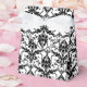 Dies ist eine besonders hübsche Gastgeschenk Hochzeit mit einem Vintagen schwarzen Damast über weißem Muster. Auf der Rückseite ist ein weißes Banner in Grau gesäumt, das mit Ihrem Text in Schwarz übersetzt wird. Lass es sagen, was du willst!