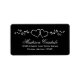 Schwarz-Weiß Doppelwinterherzen Hochzeitsmarken mit zwei Herzen und floralem Rebdesign. Die Hintergrundfarbe ist schwarz, die Schrift und das Herz sind weiß. Matching-Set-Elemente: