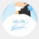 Personalisierte Hochzeitsaufkleber mit trendigem Braut- und Bräutigam-Design auf türkisblauem Hintergrund. Ideal für Gastgeschenke Hochzeiten, Hochzeiten danke Ihnen Handwerker, oder Brautparty Gefallen. Holen Sie sich die passenden Einladungen und Porto, um das Aussehen zu vervollständigen. Bild © JD Digi Designs