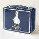 Dieses personalisierte Mittagsschachtel ist einfach duckig. Die Vorderseite des Lunchbox zeigt eine weiße Ente mit orangefarbenem Schein und Füßen in einem einfachen, realistischen Stil mit eigenem Namen oder kurzer Nachricht unten in lustiger weißer Schrift. Der Rücken weist ein Muster weißer Entenfedern auf.