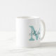 Personalisierte Namenstypographiemonogramm-Kaffee-Tasse. Vintages mit Monogramm coffeemug mit stilvollen Skriptbuchstaben. Niedlicher Geburtstag oder Gastgeschenk Hochzeitsgeschenkidee für mich und Frauen. Stilvolle Schale mit eleganten aquamarinen blauen Farben. Verfügbar als große große übergroße ExtraTasse und gehen travelmug. Doppeltes versah Entwurf mit Seiten.