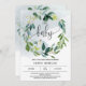 Personalisierter Kürbisbaby Dusche Einladung mit frischem Grün eucalyptus foliage Kranz und moderne rustikale Kalligraphie Schrift, Schwarze Rose ©
