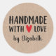 Ein personalisierter 3 Zoll rustikaler Aufkleber "handgefertigt mit Liebe" auf kraftfarbenem Hintergrund. Machen Sie es Ihren, indem Sie Ihren eigenen Namen hinzufügen. Eine hübsche Touch für alle Ihre handgefertigten Geschenke. Entworfen für Sie von BlackBerry Boulevard.