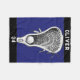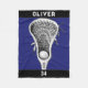 Lacrosse-Spieler oder Coach-Decken mit laxer Knüppel-und-Ball-Kunst auf blauem Teamhintergrund. So personalisieren Sie die Bearbeitung von Text, um Namen, Nummer oder auf andere Weise anpassen.