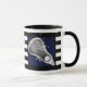 Einzigartiger Lacrosse Becher mit laxer Stick-Kunst auf marineblau-blauem Hintergrund mit schwarz-weißen Streifen. Bearbeiten Sie Text, um den Namen Ihres Lieblacrosse-Players, Coachs oder Teamsportlers hinzuzufügen.
