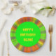 Personalisierte "Happy Birthday" Papier-Teller mit hellgelbem Text. Die begleitende Digitalkunst verfügt über ein fluoreszierendes neonfarbenes, grün und gelb abstraktes Fraktal Design, aber Sie können Ihr eigenes Foto oder Bild hinzufügen. Der grüne Neonkalk-Kreis gibt Ihnen einen Bereich auf dem Design, um benutzerdefinierten Text hinzuzufügen. Passen Sie Stil, Größe und Farbe des Schriftartes an, wie es für Ihre personalisierte Textnachricht erforderlich ist.