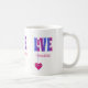 Das Wort LIEBE auf dieser Tasse ist in blauen und rosa Hauptstadt Buchstaben überlagert mit einem Muster von weißen Blume. Dies wird dreimal um die Tasse wiederholt. Ein tiefrosa Herz hängt vom Buchstaben L ab, und das kann mit Ihrem bevorzugten Namen oder Text personalisiert werden - das kann bei jedem Herzstück gleich oder anders sein. Die rosa Wörter können auch bearbeitet werden, um den Anlass Anzug. Der Standard hier ist eine Feier von Freunden und Partnern: "Freundlichkeit", "Verständnis" und "Freundschaft".