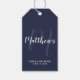 Personalisierte Monogram- und Familienname-Fvor-Tags sind mit Familiennamen in weißem, modernem Script-Schriftart-Stil und Monogramm im hellblau-modernen Script-Schriftart-Stil als Hintergrund mit etablierten Jahren in weißen Sans Serif-Schriftart-Stil auf marinebasischem Hintergrund ausgestattet. Ideal für Wiedersehen-Liebhaber.