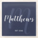 Personalisiertes Monogramm und Familiennamensgeschenk mit Familiennamen in weißem, modernem Script Schriftart Stil und Monogramm in hellblau modernen Drehbuch-Schriftart Stil als Hintergrund mit etablierten Jahr in weißen Sans Serif Schriftart Stil auf marineblau Hintergrund. Perfekt als Geschenk für Neuvermählte, Familiengeschenk, Familienspass und Wiedersehen für alle besondere Anlässe.