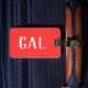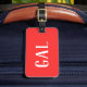 Das rote Gepäckanhänger enthält auf der einen Seite Ihre Monogramm-Initialen und auf der anderen Ihren Namen und Ihre Adresse. Der Schriftart ist glamourös und elegant in knalligem Weiß.