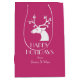 Ein einzigartiger, rosa Weihnachtswein-Geschenksack mit weißem Rentierkopf-Druck und personalisierten Namenspressen und Geschenkbotschaften auf der Vorder- und Rückseite. Passende Weihnachtsgrüßkarte, Briefmarke, Adressetiketten und Weihnachtsgeschenke im ScriptoGraphic Design Geschenkladen